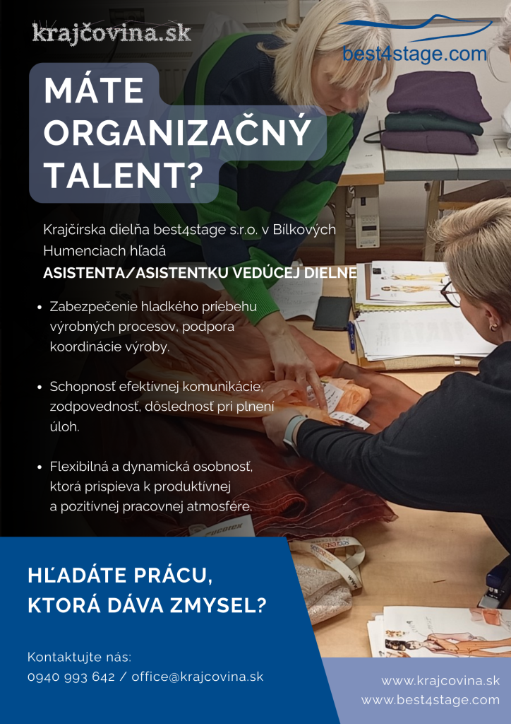 Krajčírska dielňa best4stage s.r.o v Bílkových Humenciach rozširuje pracovný tím krajcovina.sk a otvára dve voľné pracovné pozície Asistent/asistentka vedúcej dielne a Krajčírka.